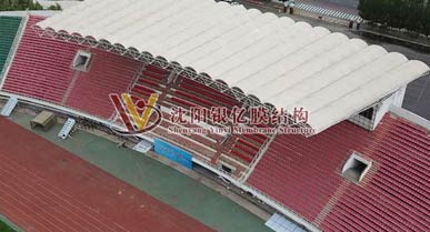 ————本工程位于大连庄河渤海大学体育场,工程面积1900㎡;施工内容:钢结构及膜材料制作加工安装